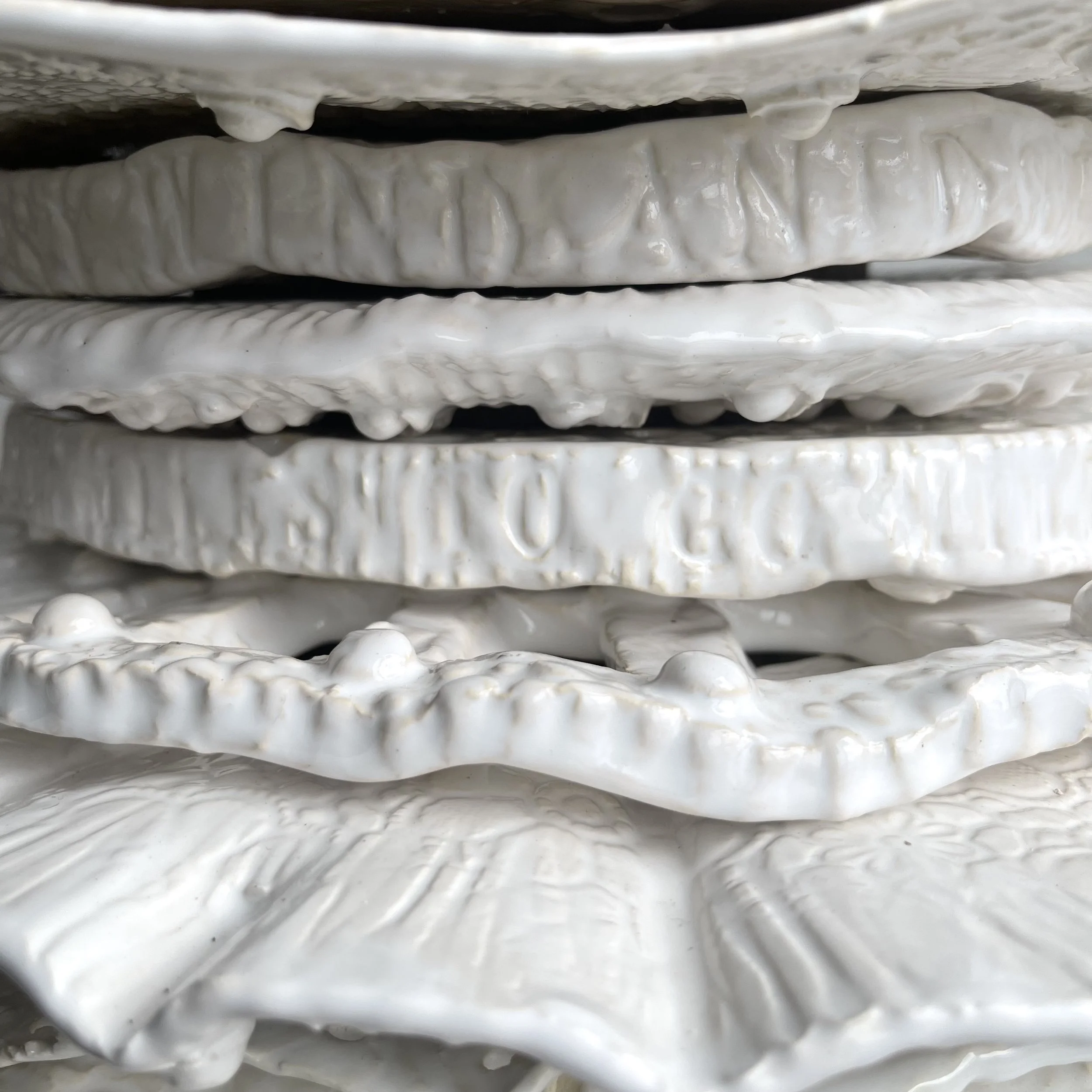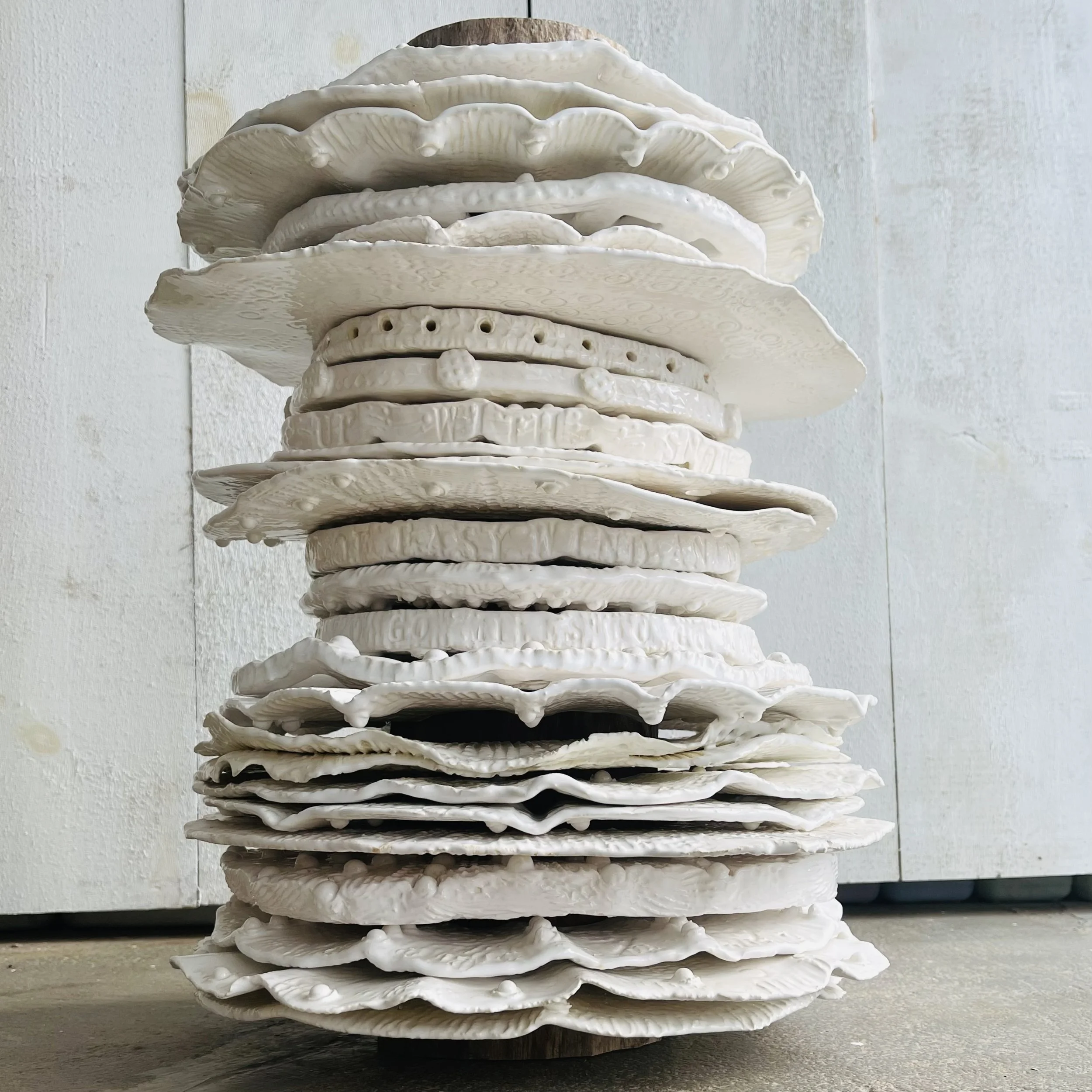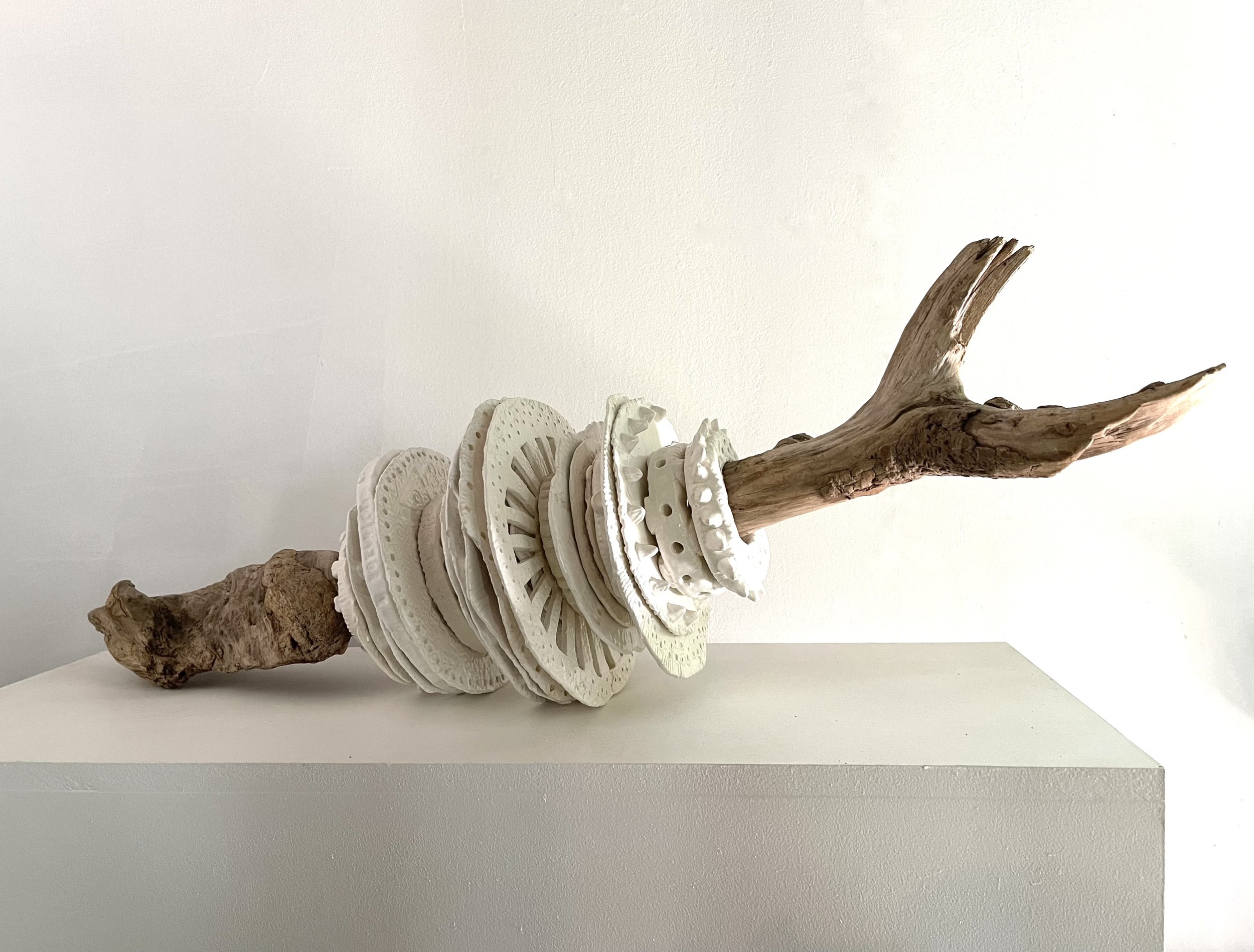 Wood serves as host to layered ceramic discs of varying size, thickness and pattern. Through accumulation, the materials transform: what begins as wood and clay dissolves into something else entirely, as if a new organism were pulling itself into being.